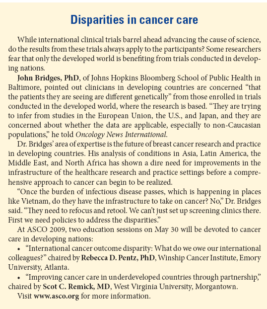 What makes these sites so appealing? Factors include a large number of treatment-nave patients, faster patient enrollment times, and emerging economic power. Extending clinical trials to Asian populations also enlarges the knowledge base about cancer and the relative efficacy of treatments. For example, the IPASS trial, conducted in nine Asian countries, confirmed that Asian nonsmokers with adenocarcinoma of the lung had a higher response to gefitinib (Iressa) than other groups. And Indian breast cancer patients appear to have more triple-negative and grade 3 tumors, more aggressive mucinous carcinomas, and possibly a higher incidence of BRCA1-associated tumors, according to information from BIG.