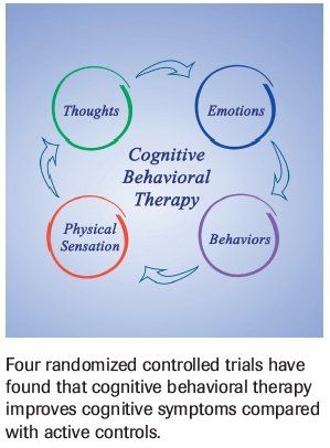 CBT is a psychotherapeutic approach involving short-term, goal-oriented problem-solving strategies to change patterns of thinking. Four trials have assessed the efficacy of CBT or compensatory strategies training in women with breast cancer. Two were quasi-randomized,[56,57] one was a pilot study,[58] and the other was a small RCT.[59] Results across all trials were equivocal, with the RCT indicating an improvement in cognitive symptoms compared with active controls.[59]