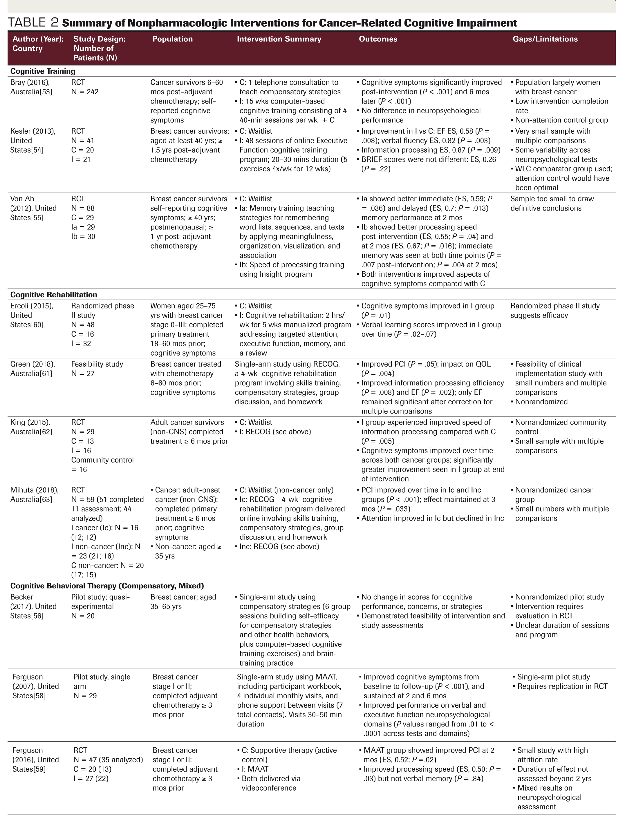 Table 2, Part 2. Summary of Nonpharmacologic Interventions for Cancer-Related Cognitive Impairment