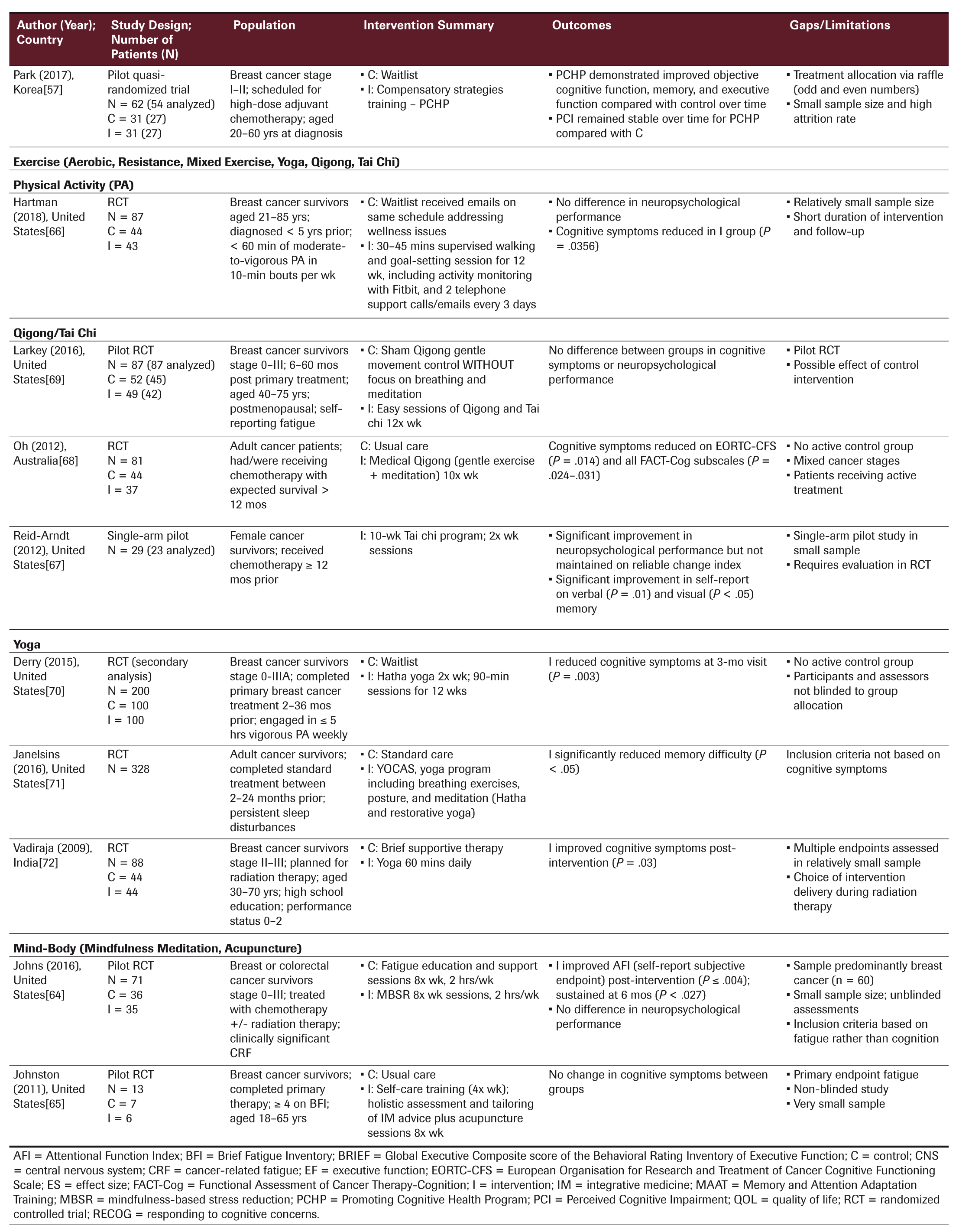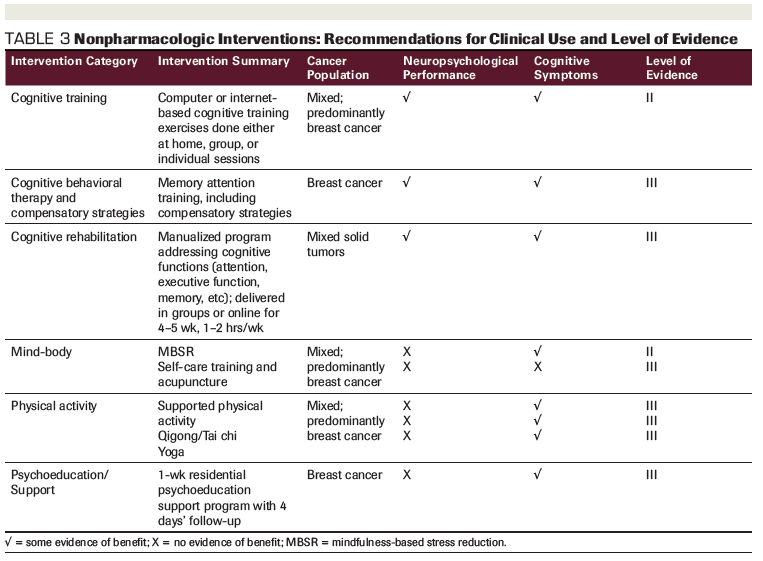 CRCI can be managed with several nonpharmacologic strategies that address brain changes through: 1) neuroplasticity models (cognitive training, rehabilitation); 2) coping (cognitive behavioral therapy [CBT], compensatory strategies); or 3) reducing related symptoms (physical activity, mind-body). The evidence to support each intervention is summarized here and in Table 2, and Table 3 provides a summary of the levels of evidence for each intervention category.