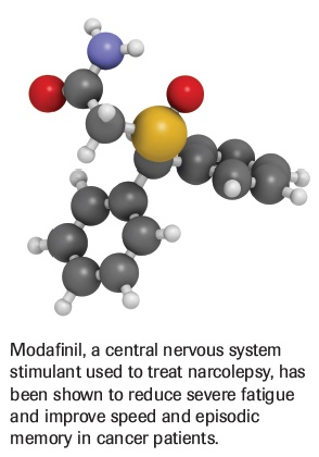 Modafinil is a CNS stimulant generally used to treat narcolepsy. It has been shown to reduce severe fatigue in cancer patients.[77] A secondary analysis evaluating cognitive function in 82 breast cancer survivors with fatigue suggested some improvement in speed and episodic memory on a computerized test in the modafinil group.[78] Another study of 28 patients with advanced cancer found some improvement in psychomotor speed and visual information processing 4.5 hours after modafinil compared with placebo.[79]