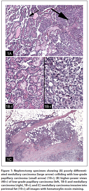 Figure 1: Nephrectomy specimen showing (A) poorly differentiated medullary carcinoma (large arrow) colliding with low-grade papillary carcinoma (small arrow) (10×); (B) higher-power views (40×) of low-grade papillary carcinoma (left, 1B-l) and medullary carcinoma (right, 1B-r); and (C) medullary carcinoma invasive into perirenal fat (10×); all images with hematoxylin-eosin staining.