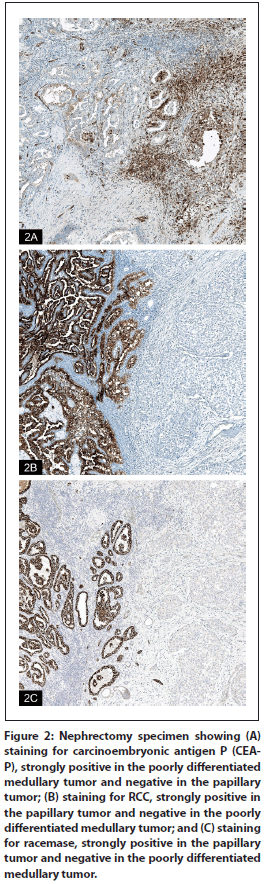 Figure 2: Nephrectomy specimen showing (A) staining for carcinoembryonic antigen P (CEAP), strongly positive in the poorly differentiated medullary tumor and negative in the papillary tumor; (B) staining for RCC, strongly positive in the papillary tumor and negative in the poorly differentiated medullary tumor; and (C) staining for racemase, strongly positive in the papillary tumor and negative in the poorly differentiated medullary tumor.