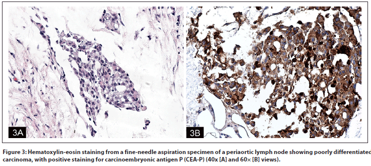 Figure 3: Hematoxylin-eosin staining from a fine-needle aspiration specimen of a periaortic lymph node showing poorly differentiated carcinoma, with positive staining for carcinoembryonic antigen P (CEA-P) (40x [A] and 60× [B] views).