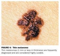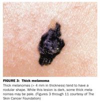 Thick melanomas (> 4 mm in thickness) tend to have a nodular shape. While this lesion is dark, some thick melanomas may be pale. (Figures 3 through 11 courtesy of The Skin Cancer Foundation)