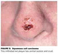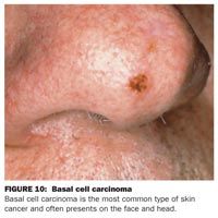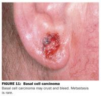 Basal cell carcinoma may crust and bleed. Metastasis is rare.