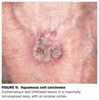 Erythematous and infiltrated lesion in a maximally sun-exposed area, with an erosive center.