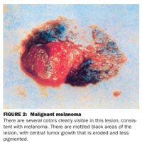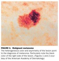 The heterogeneous color and asymmetry of the lesion point to the diagnosis of melanoma. Particularly note the black color of the right side of the lesion. (Figures 1 and 2 courtesy of the American Academy of Dermatology)