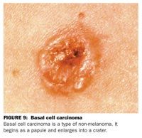 Basal cell carcinoma is a type of non-melanoma. It begins as a papule and enlarges into a crater.