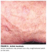 Actinic keratosis may present as a dry, rough-textured patch on the skin.