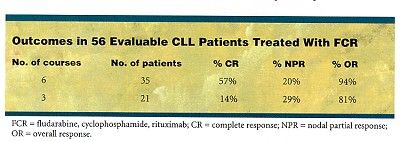 The patients, Dr. Keating noted, were younger than a typical CLL population (median, 58 years). Forty percent were Rai stage III-IV, and the median white blood cell count was 111 × 103/mL. Fifty-six patients were evaluable for response.