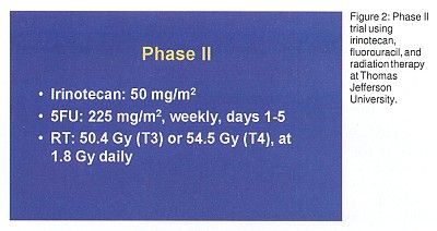 Dr. Mitchell and colleagues at Jefferson conducted a phase I study to determine the maximum tolerated dose (MTD) of weekly irinotecan combined with 5-FU and concomitant RT given preoperatively. Patients had primary or recurrent stage T3/T4 rectal adenocarcinoma previously untreated with chemotherapy or radiation. This regimen was then used in a phase II trial (Figure 2).