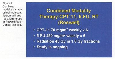 Irinotecan used in part as a radiosensitizer is being studied in combination with 5-FU and radiation in an ongoing study at Roswell Park Cancer Institute (Figure 1). Early results of this study have been encouraging," Dr. Mitchell said.