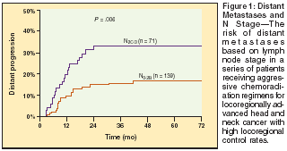 So why continue to attempt to resurrect induction chemotherapy? The answer lies in the ability to "induce" something (such as an improvement in survival by decreasing distant metastases), and to predict those for whom an induction is needed (patient subsets who benefit from induction chemotherapy). Traditionally, squamous cell head and neck cancer patients have died from locoregional recurrence and have not lived long enough to manifest metastatic disease. Because high locoregional relapse rates lead to short survival times, the benefit of reduction in distant metastases demonstrated in several studies was of little value in reducing head and neck cancer deaths, which occurred locoregionally. Data from our group predict that when locoregional control rates are high, patients with N2 or N3 disease will be more likely to develop distant metastases than locoregional recurrence (Figures 1 and 2).[1] Distant failure occurs in approximately 30% to 40% of these advanced-stage patients with positive lymph nodes. A one-quarter to one-third reduction in the rate of distant metastases, the risk reduction realized in several studies of induction 5-FU and cisplatin,[2] could then turn into a measurable 5% to 15% reduction in death-perhaps higher if the induction chemotherapy regimen contributes to locoregional control. Importantly, one could only expect to see this survival benefit if locoregional disease is controlled. More recently, a number of studies (Table 6 in the article by Argiris et al) have examined the combination of induction chemotherapy followed sequentially by CRT. It is from these studies that hypotheses supporting induction chemotherapy can be derived.