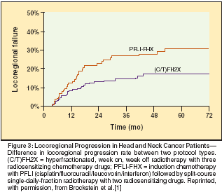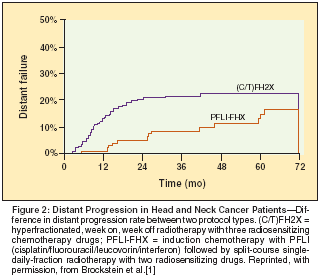 Our multi-institutional group performed a series of five studies involving 337 locoregionally advanced stage IV patients between 1989 and 1998.[1] In the first two studies, an intensive and effective induction chemotherapy regimen, PFLI (cisplatin, 5-FU, leucovorin, and interferon) preceded split-course once-daily radiotherapy (RT) plus concomitant 5-FU and hydroxyurea. In the last three studies, induction chemotherapy was eliminated, and locoregional therapy was intensified with hyperfractionated split-course RT plus concomitant chemotherapy. A striking and statistically significant reversal of failure patterns was seen in this retrospective analysis of well-balanced patients from prospective studies (Figures 2 and 3).[1] The actuarial 5-year rates of locoregional recurrence in the induction, conventionally fractionated RT arm and no induction, hyperfractionated RT arm were 31% and 17%, respectively, whereas distant recurrence rates were 13% vs 22%.[1]
