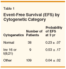 Regarding the purported uniqueness of transplant, in 1996 we published data suggesting that treatment of high-risk MDS (International Prognostic Scoring System [IPSS] categories intermediate-2 or high) with the same chemotherapy we gave acute myelogenous leukemia (AML) patients produced long-term results similar to those of allogeneic HSCT, at least as published by researchers at the Fred Hutchinson Center Research Center (and at least in young patients with normal cytogenetics).[1] Writing this commentary prompted an update. Between 1991 and 2000, we gave AML-type therapy to 156 patients under age 60 with MDS and > 5% blasts in either marrow or blood. Patients received a variety of regimens, linked by the use of cytarabine at a daily dose of 1 to 2 g/m2 for 4 to 5 days. The median age was 50, 115 had refractory anemia with excess blasts in transformation (RAEB-t), 38 had refractory anemia with excess blasts (RAEB), and 3 had chronic myelomonocytic leukemia. Overall, 57% were scored as IPSS high and 43% as IPSS intermediate-2. The probability of event-free survival was 0.12 ± .03 at 3 years and 0.11 ± .03 at 5 years. I quote the 3-year figure both because it is frequently used by Drs. Thompson and Luger, and because patients can be considered "potentially cured" once they have been in remission this long. In particular, as shown by the similarity between the 3- and 5-year event-free survival rates, the failure rate becomes very low after 3 years. More important than the overall results noted above are those within different cytogenetic categories (Table 1). Superior Outcome?