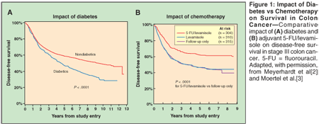 (3) These datasets rarely provide any information on comorbidity. This has two consequences. First, these datasets ignore potential confounding factors that can have effects as great as the treatment itself. Consider, for example, Figure 1. The impact of diabetes on disease-free survival is comparable to the impact of adjuvant fluorouracil (5-FU)/levamisole on disease-free survival in stage III colon cancer.[2,3] Therefore an uncontrolled imbalance in diabetic patients could significantly flaw the results of an adjuvant trial. Similarly, an imbalance in inflammatory diseases could skew findings on the use of nonsteroidal anti-inflammatory drugs (NSAIDs).[4]