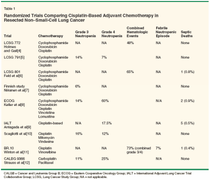 The treatment-related toxicities and infectious complications associated with adjuvant chemotherapy in non- small-cell lung cancer can have significant economic impact. For instance, in the year 2000, Statistics Canada reported 11,404 new primary lung cancer diagnoses in Canada.[16] Roughly 30% of these patients undergo surgical resection for primary treatment.[14] It is projected today in the oncology community that another 60% of these patients will be given adjuvant chemotherapy for their disease, implying that over 2,000 new patients per year in Canada will be subjected to the toxicity of chemotherapy and the risk of infectious complications.
