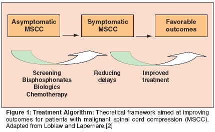 In this issue of ONCOLOGY, Dr. Ruckdeschel addresses a subject that, fortunately, is not very common, but unfortunately for those in whom the problem occurs, the outcomes are almost universally poor. The subject is probably one of the most dreaded complications of advanced cancer-malignant spinal cord compression. On a positive note, since Dr. Patchell's plenary session presentation at the 2003 American Society of Clinical Oncology Annual meeting,[1] interest in metastatic spinal cord compression has been renewed and there is hope that future patients with this problem will fare better. In order to improve results in these patients, a theoretical framework can be proposed based on the natural history of the process (Figure 1).[2] In fact, Dr. Ruckdeschel addresses a number of these issues in the management of spinal cord compression as a means of improving outcomes for these patients. His discussion includes the importance of early detection, timely work-up of patients suspected of having cord compression, and optimal treatment strategies based on the patient's presenting clinical and radiologic features. Early Diagnosis