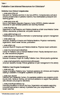 Both the Liaison Committee for Medical Education (LCME) and the Accreditation Council for Graduate Medical Education (ACGME)[36,37] now require or strongly encourage under- and postgraduate training in palliative care in order to accredit programs.[ 38,39] More than 25% of teaching hospitals have established palliative care clinical services, the necessary platform for clinical training. Physicians already in practice may gain knowledge and skills through a range of national courses, Web-based resources, and preparation for the certifying exam given annually by the American Board of Hospice and Palliative Medicine (Table 1).[3] Conclusion