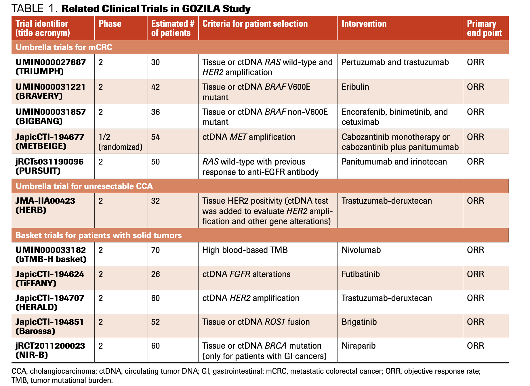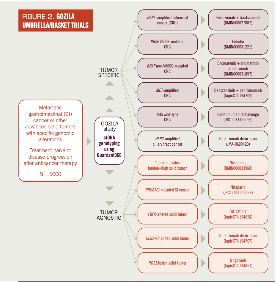GOZILA provides the broad screening platform for various umbrella/basket clinical trials for targeted therapies, including those in which the targets are ERBB2 (HER2), BRAF V600E, BRAF non-V600E, and MET amplifications; FGFR alterations; ROS1 fusions; BRCA mutations; and TMB. The TRIUMPH study results suggest promising ORRs, PFS, and OS in patients with ctDNA RAS wild-type and HER2-amplified mCRC. Wild-type RAS, BRAF, PIK3CA, and HER2 were also predictors of response to study treatment.