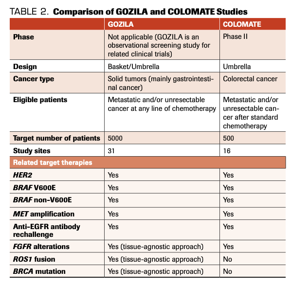 Although only patients with metastatic colorectal cancer (mCRC) who had previously received standard chemotherapies are eligible for the COLOMATE study, patients with various types of solid tumors at any line of treatment are eligible for GOZILA. This broad coverage of the eligible population allows a target of 5000 patients. By contrast, effective screening of selected candidate patients for companion trials using rapid turnaround time by ctDNA-based NGS assay is the key for COLOMATE. The companion trials of targeted therapies in mCRC are similar between GOZILA and COLOMATE. Both studies have identified patients eligible for studies by examining ERBB2 (HER2), BRAF V600E, BRAF non-V600E, and FGFR alterations, as well as MET amplification and rechallenge with anti-EGFR antibodies. The existence of various companion trials for common alterations that can be potential therapy targets on the 2 platforms can lead to future international collaboration.