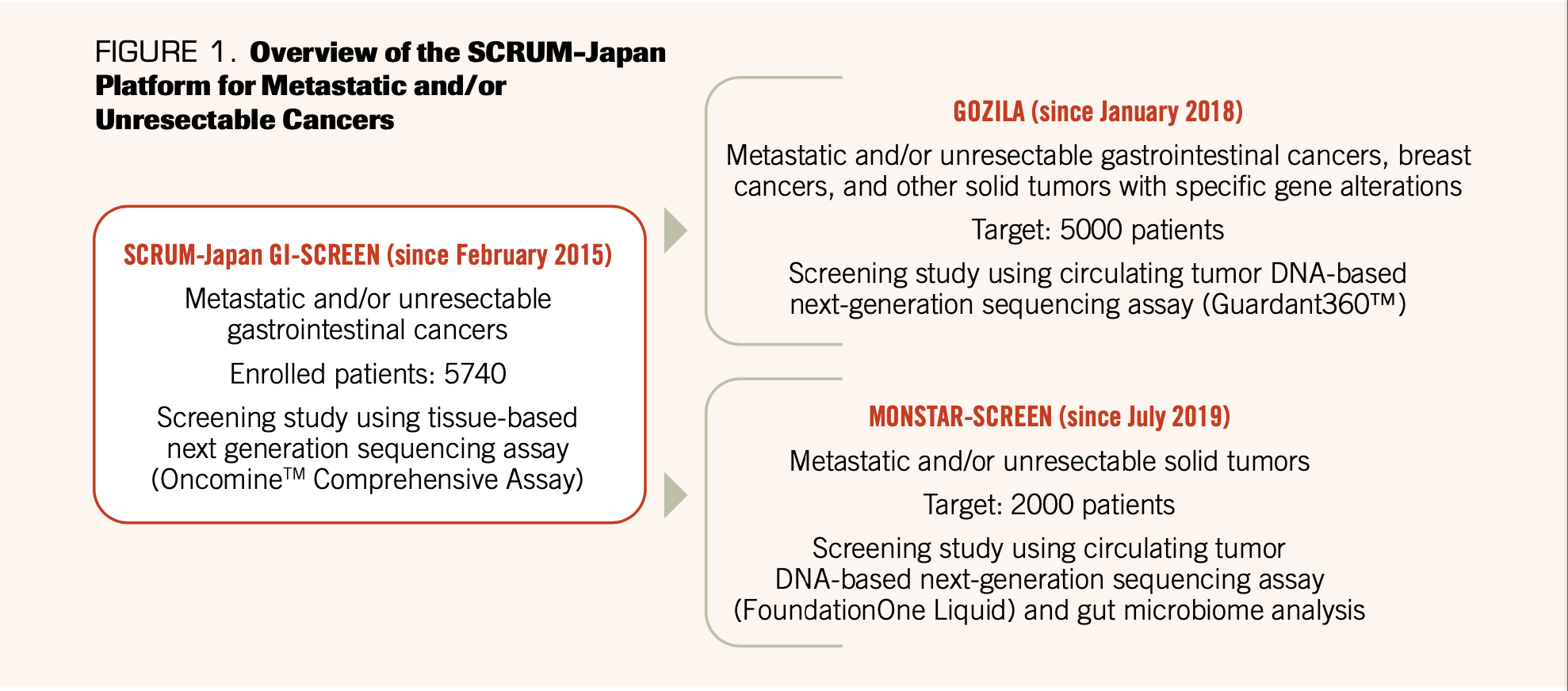 consortium for lung cancer, the LC-SCRUM-Japan, was launched in February 2013. The LC-SCRUM-Japan originally aimed to identify patients harboring ROS1 and RET fusions originally discovered in Japan.8 In February 2014, the GI-SCREEN-Japan multicenter screening project also started for gastrointestinal (GI) cancer. The project began to screen for BRAF, NRAS, and PIK3CA mutations in patients with mCRC.9 In February 2015, these 2 groups merged and initiated the SCRUM-Japan project as a collaboration of industry, government, and academia to achieve nationwide cancer genome screening for precision medicine in Japan (UMIN000016343; UMIN000016344).10 From February 2015 to June 2019, 5740 patients with GI cancer were investigated using the tissue-based Oncomine Comprehensive Assay (Thermo Fisher Scientific, Waltham, MA, USA). Subsequently, in January 2018, we initiated GOZILA, a screening study based on the SCRUM-Japan platform using comprehensive ctDNA sequencing by Guardant360™ (Guardant Health, Redwood City, CA, USA) to rapidly screen patients for trial eligibility.11,12 Further, in July 2019, we started MONSTAR-SCREEN (UMIN000036749), a multi-omics profiling and monitoring study using ctDNA sequencing by FoundationOne Liquid (Foundation Medicine, Cambridge, MA, USA) and gut microbiome analysis (Figure 1).