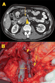 Patient with pancreatic adenocarcinoma before (A) and during (B) surgery.