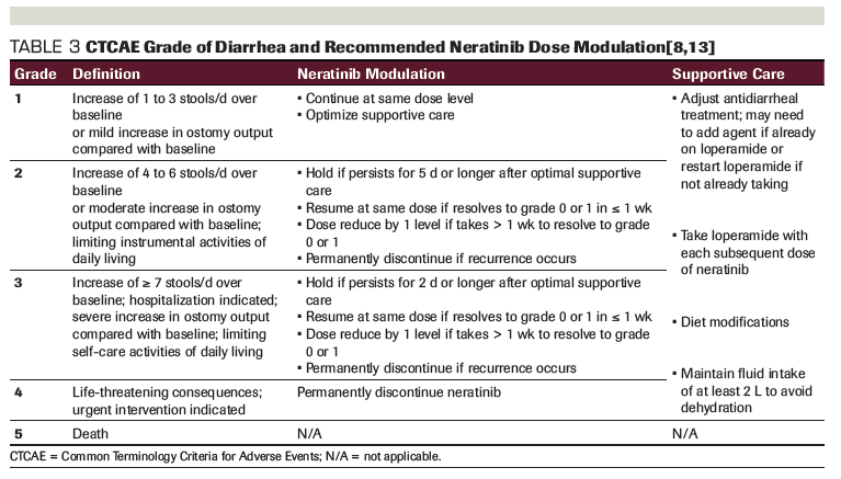 Providers should be aware of the risk of diarrhea with neratinib initiation and proactively prescribe colestipol 1 g PO BID × 4 weeks in conjunction with loperamide 4 mg PO TID × 2 weeks, 4 mg BID for weeks 3 to 8, and then as needed thereafter. If this approach is unsuccessful, dose modulation of neratinib should occur, according to Common Terminology Criteria for Adverse Events (CTCAE) grade (Table 3). Other agents could be employed in the treatment of diarrhea, should it continue, and may include: codeine, octreotide, budesonide, and antibiotics.[11] Supportive care should be maximized at the onset of any grade of diarrhea. Neratinib should be held for complicated diarrhea that includes features of dehydration, fever, hypotension, renal failure, or neutropenia (absolute neutrophil count < 1,000/mm3). If constipation is experienced, the dose of loperamide should first be decreased or the schedule altered to be less frequent, but not initially abandoned. Neratinib should be discontinued if the toxicity does not recover to ≤ grade 1, if the toxicity results in a treatment delay of more than 3 weeks, or in patients unable to tolerate 120 mg in the absence of baseline organ dysfunction.[8]
