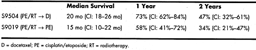 CONCLUSION: Consolidation docetaxel following concurrent PE/radiotherapy is feasible and tolerable. Neutropenia is dose-limiting. The survival endpoints achieved in pathologically documented stage IIIB non–small-cell lung cancer are highly encouraging and unprecedented in available literature. Further study of the S9504 regimen is warranted.