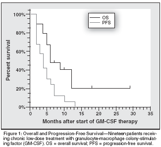 Recently, only one patient was free from progression and seven patients are still alive, resulting in a median progression-free survival of 4 months and a median overall survival of 6 months (see Figure 1). Patients benefiting from therapy had a progression- free survival of 6 months. Six of these patients are still alive, so that the median survival time in this subgroup has not yet been reached. Interestingly, 6 of 7 patients responding to GM-CSF and 9 of 11 patients benefiting from GM-CSF but only 1 of 8 patients with progression developed mild to moderate leukocytosis.