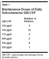 Dendritic cells are the most important antigen-presenting cells able to establish an intrinsic cellular immunologic response against autologous tumor cells. GM-CSF has therefore been used as part of cytokine cocktails for ex vivo expansion of dendritic cells from peripheral blood mononuclear cells.[2] Local or systemic administration of GM-CSF alone or in combination with interferons and interleukins also increases the dendritic cell fraction in vivo.[3,4] In metastatic melanoma, GM-CSFbased cytokine combinations have now become a routinely used immunotherapy.[ 3,5] In contrast, singleagent GM-CSF treatment is far less well established at present. However, adjuvant low-dose prolonged administration GM-CSF has significantly improved the median survival of patients with stage III and IV melanoma in a single institution trial.[5] The local and systemic toxicity of this regimen was remarkably low. Moreover, peritumoral GM-CSF injection has prolonged the survival of individuals with metastatic melanoma, an effect that cannot be explained by local effects alone.[6] At present, data on systemic GMCSF treatment in epithelial tumors other than prostate cancer are still lacking.[7,8] Nonetheless, this approach may be particularly interesting in gynecologic tumors since GM-CSF modulated activation of transforming growth factor-beta (TGF-beta) receptors has been shown to be a negative autocrine growth regulation mechanism in derivates of normal and neoplastic Mllerian epithelium.[ 9,10] Based on observations we have made in some individuals with breast or ovarian carcinoma treated with low-dose subcutaneous molgramostim, chronic rather than intervallic administration of GM-CSF may be crucial for establishing a sustained antitumoral immune response (Kurbacher, unpublished data, 2002). This open-label pilot trial was therefore initiated to investigate the activity and toxicity of continuous low-dose GM-CSF monotherapy in heavily pretreated patients suffering from either metastatic breast or female genital tract carcinomas. Patients and Methods A total of 19 patients with intensively pretreated metastatic breast cancer (n = 7), recurrent ovarian carcinoma (n = 10), recurrent endometrial carcinoma (n = 1), or recurrent squamous cell cancer of the cervix uteri (n = 1) were recruited into this pilot trial. Prior to study entry, patients had failed a median of 4 prior systemic treatments (range: 2-7). Metastatic breast cancer patients had undergone 3 to 5 (median: 5) prior therapies including anthracyclines in 6 cases and taxanes in 5. Patients with gynecologic tumors had failed a median of 3 (range: 2-7) prior cytotoxic treatments, all comprising both platinum compounds and taxanes. Patients had either bidimensionally measurable lesions or evaluable disease (elevated or rising CA 125 serum levels). Inclusion criteria were as follows: (a) Karnofsky performance status ≥ 60%, (b) absence of severe hematologic and serologic abnormalities, (c) no history of colony-stimulating factor (CSF)-related homogeneously staining regions or any other serious adverse events related to the use of colony-stimulating factors, (d) absence of serious medical disorders other than those related to advanced tumor burden, (e) estimated life expectancy ≥ 8 weeks, and (f) written informed consent. This trial was performed in accordance with the institutional ethical guidelines and the German law (Arzneimittelgesetz). GM-CSF was administered as daily subcutaneous injections. Hematologic functions were controlled every second week by whole blood cell counts with leukocyte differentiation. Therapy was monitored by biweekly tumor marker determinations and an adequate tumor imaging performed every 8 weeks (in patients with measurable disease). The starting dose of GM-CSF was 125 μg/d, which was increased at increments of 25 μg/d after every second week of treatment up to a maximum of 250 μg/d until an objective tumor response was achieved. Dose intensification was discontinued in the case of any local or systemic toxicity, a total leukocyte count > 20 g/L, or eosinophils > 15%. GM-CSF therapy was continued until there was clear evidence of primary or secondary treatment failure or the occurrence of side effects exceeding National Cancer Institute Common Toxicity Criteria (NCICTC) grade 2. Responses were classified using common Eastern Cooperative Oncology Group (ECOG) criteria (in patients with measurable disease) or Rustin criteria (in patients with evaluable disease). Overall survival was calculated from the start of therapy until death from any cause or loss to follow-up. Results All patients treated were evaluable for both toxicity and response. The maintenance dose was 125 μg/d in 4 patients, 150 μg/d in 10, 175 μg/d in 2, 200 μg/d in 2, and 250 μg/d in 1 patient, respectively (median: 150 μg/d; mean: 158 μg/d) (see Table 1). Treatmentrelated toxicities are shown in Table 2. Ten patients developed mild to moderate leukocytosis (10-20 g/L). Generally, GM-CSF treatment was well tolerated. No patient suffered from hypersensitivity-like reactions, fluid retention, edema, or impairment of cardiac function. Mild to moderate flu-like symptoms (arthralgia, myalgia, bone pain, mild to moderate febrile reactions) not exceeding NCI-CTC grade 2 were the most frequent side effects. Grade 1 injection site reactions occurred in three patients. In only one patient, GM-CSF therapy was terminated because of unresolved grade 3 fatigue requiring hospitalization. Any other severe or life-threatening complications were not observed. Detailed information concerning therapeutic efficacy can be obtained from Table 3. One complete and six partial responses accounted for an objective response rate of 37% (confidence interval [CI]: 16%-62%) with a median response duration of 6 months (range: 4-13 months). Four additional patients achieved disease stabilization of 3 to10 months. Only eight patients progressed on therapy. In summary, 11 patients (5