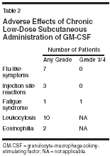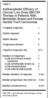Discussion GM-CSF is a powerful cytokine that plays a crucial role in the generation of antigen-presenting cells from blood and tissue precursors both ex vivo and in vivo.[2,5] Accompanying interleukins and interferons, it is therefore an integral component of different combination regimes used for both immunotherapy of clinical malignancies and ex vivo activation of dendritic cells.[2] Recently, an increasing body of evidence exists suggesting that GM-CSF treatment is able to expand the dendritic cell population in both the peripheral blood and tumorassociated lymph nodes.[3,4] Compared to immunotherapy using ex vivo generated dendritic cells, GM-CSF given directly to patients may be a reasonable and easier to handle alternative. In advanced malignant melanoma, single-agent subcutaneous or perilesional GM-CSF has already been used successfully as systemic treatment after complete or incomplete surgical resection.[5] However, experience with this therapy in other solid tumors including breast and gynecologic malignancies is still limited. In prostate cancer, some serologic responses and disease stabilizations have been reported.[7,8] The incidence of both severe toxicities and elevation of white blood cell counts was neglected in all these trials, which did not utilize GM-CSF continuously. However, our personal experience with two patients previously treated with molgramostim has led us to conclude that continuous exposure to GMCSF may be crucial for a maintained immunologic response (Kurbacher, unpublished data, 2002). Since the balance of pro- and antitumoral effects induced by GM-CSF appears to be dose-dependent, administration of very low doses may well be another important determinant of its clinical efficacy.[11] This trial, which to our knowledge is the first of its kind in breast or female genital tract cancer, was therefore initiated to evaluate both the safety and antineoplastic efficacy of chronic low-dose subcutaneous GM-CSF. Starting with a very low dose of 125 μg per day, most patients were exposed to chronic GM-CSF at 150 to 175 μg daily. In general, the treatment was well tolerated. Only one patient experienced grade 3 toxicity (fatigue) and was thus withdrawn from the study. As could be expected from other immunotherapy trials, flu-like symptoms were frequent but never dose-limiting. Regarding the intensive pretreatment of most patients, the objective response rate of 37% with one complete response and six partial responses was exceptionally high considering that another four patients experienced durable disease stabilization. The median response duration (6 months) was long enough to indicate significant clinical utility. Interestingly, a mild to moderate increase of the whole blood count was noticed in 6 of 7 responders but in only 1 of 8 patients progressing while receiving GM-CSF. Leukocytosis may thus be a valuable surrogate marker for further clinical response to GM-CSF. At present, there is no evidence that chronic bone marrow stimulation was harmful to any of the patients. In particular, there was no evidence of impaired cardiac function in the treated population, which may be associated with higher doses of GM-CSF.[12] Although the number of patients is still too small to draw any definite conclusion, a trend suggests that patients with tumors arising from the Mllerian epithelium (specifically, ovarian carcinoma) may benefit the most from chronic GM-CSF therapy. This seems to be of particular interest since several authors have shown that GM-CSF acts as a negative autocrine growth factor in the normal and neoplastic endometrium.[9,10] It may therefore well be that GM-CSF in these tumors has a pleitropic effect by both activating the dendritic cell-mediated antitumor response and directly inducing a growth arrest by stimulating intratumoral GM-CSF receptors. Conclusion In conclusion, chronic low-dose GM-CSF was safe and highly active in this heavily pretreated population of patients. The results of our study offer a new and practical approach to immunotherapy in patients with solid tumors others than melanoma or renal cell cancer and, therefore, warrant confirmation by larger-scaled clinical trials.