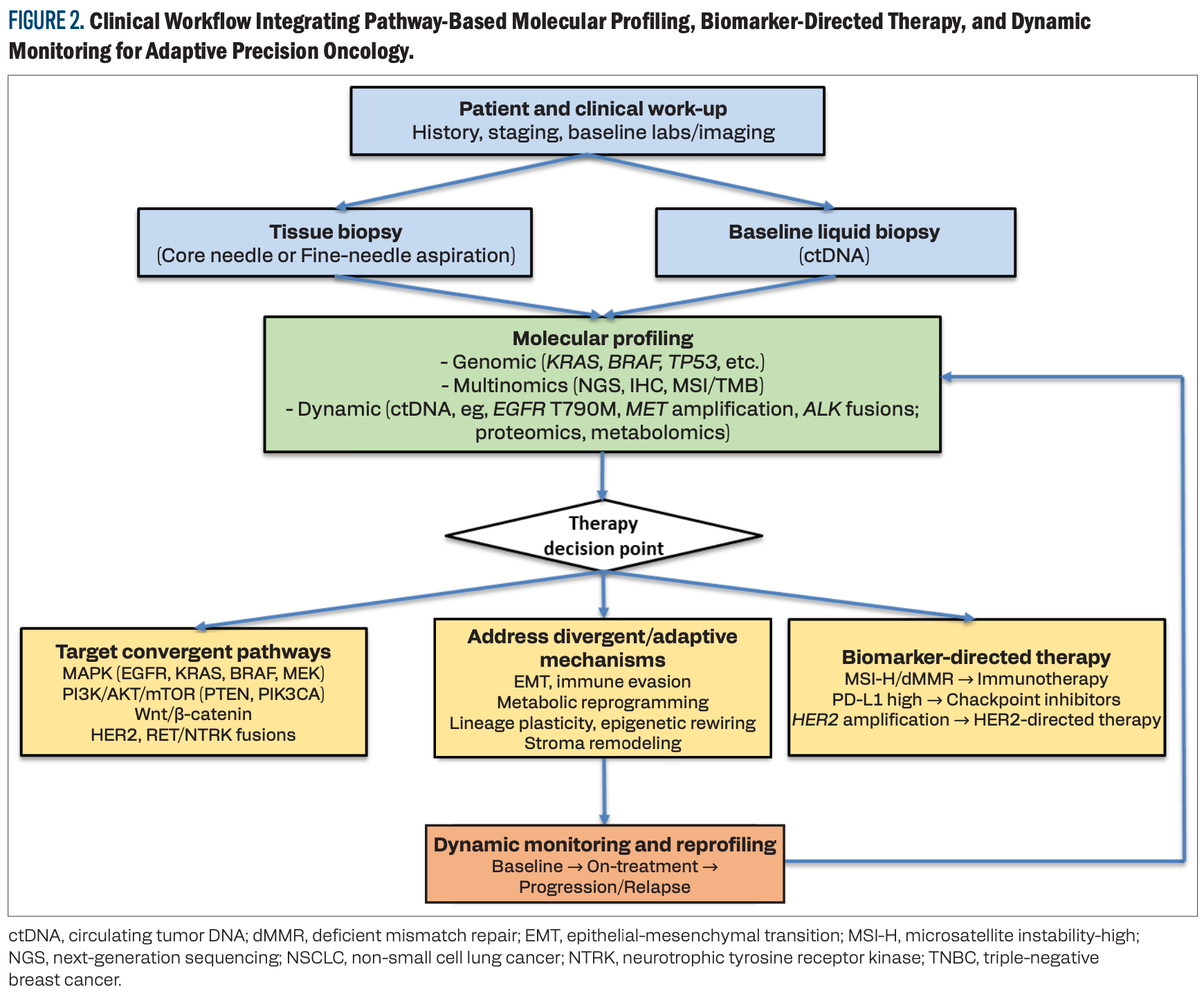 FIGURE 2. Clinical Workflow Integrating Pathway-Based Molecular Profiling, Biomarker-Directed Therapy, and Dynamic Monitoring for Adaptive Precision Oncology
