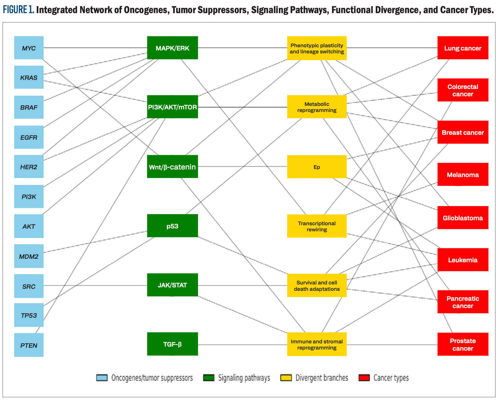 Cancer progression involves complex disruptions in the cellular signaling pathways that govern proliferation, differentiation, survival, and interactions within the tumor microenvironment (TME). Although the genetic alterations driving cancer are highly heterogeneous, their functional consequences often converge onto a limited set of evolutionarily conserved signaling networks. The MAPK, PAM, and Wnt/β-catenin pathways, among others, represent recurrent hubs targeted by diverse oncogenic events in cancer.1-3 Notably, distinct mutations, such as KRAS mutations in colorectal, pancreatic, and lung cancers,4 HER2 amplifications in diverse cancers, including breast and gastric,5 or PTEN loss in prostate and glioblastoma,6,7 activate these common pathways, underpinning the concept of signaling convergence. Understanding how these pathways are maintained, modified, or co-opted in various cancers provides crucial insights into the fundamental drivers of tumor behavior and underscores the necessity of pathway-targeted therapeutics.
