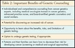 Genetic counseling is designed to help guide patients through the cancer risk–counseling process to identify their risk for cancer (Table 2). Cancer-risk counselors also help patients who are uncertain about their family’s medical history or have concerns about other cancers, by obtaining medical records and pathology reports from the various healthcare centers at which patients and their family members have been treated. Many cancer genetics specialists work together in a multidisciplinary team that may include medical oncologists, advanced-practice nurses in genetics, board-certified genetic counselors, and Master’s-prepared licensed clinical social workers.