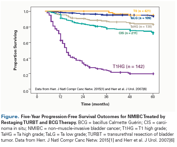 What is the fate of patients with re-resected T1 bladder cancer who are treated conservatively? The Figure shows progression-free survival outcomes for 1,021 patients with non–muscle-invasive bladder cancer, categorized by tumor stage after second TURBT. These patients were treated using intravesical immunotherapy with bacillus Calmette Guérin (BCG), which forestalled tumor progression in the majority of patients with no residual T1 cancer or with non-T1 disease. Of 142 patients with residual T1 cancer upon re-resection, 78% progressed to muscle invasion (median, 16 months) and one-third later died,[1] including patients who had responded initially to BCG therapy.[6] A recent evaluation of European trials showed that patients with high-grade T1 disease fare poorly on currently recommended BCG maintenance schedules, suggesting that alternative treatments (ie, cystectomy) are urgently required.[7]