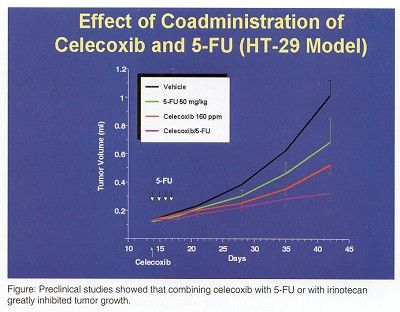 Preclinical studies showed that combining celecoxib with 5-fluorouracil (5-FU) or with irinotecan greatly inhibited tumor growth.