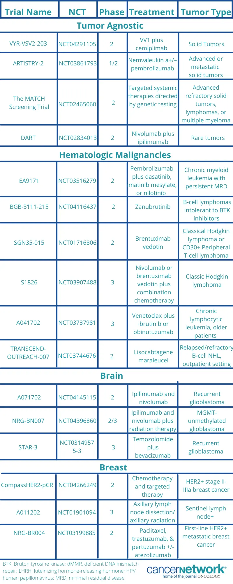 Current clinical trials within the program include those in patients with a range of different malignancies, such as melanoma, advanced pancreatic cancer, gastrointestinal cancers, advanced lung cancer, and hematologic malignancies (Table 1&2). Atlantic Health System currently offers approximately 90 clinical trials, 15 to 20 of which are phase 1 studies, according to Whitman.