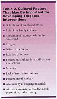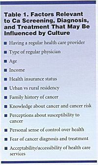 Table 1 shows a number of factors related to receiving optimal cancer screening, diagnosis, and treatment that may be influenced by cultural factors.[26]