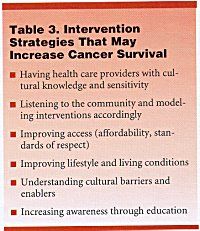 Cultural factors that vary greatly among subpopulations may play an important role in cancer survivorship, and may be important in developing interventions targeted to specific subpopulations (Table 2). Further research into the impact of these cultural factors within subpopulations will help in the development of successful targeted interventions. See Table 3 for a list of strategies that may be effective in increasing survivorship.