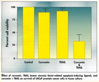 LNCaP, an androgen-sensitive human prostate cell line, is moderately sensitive to the induction of apoptosis by TNF (tumor necrosis factor)-related apoptosis-inducing ligand (TRAIL). In the study, the researchers aimed to find out whether curcumin and TRAIL cooperatively interact to increase apoptosis in this prostate cancer cell line. The researchers also sought to find the mechanism by which TRAIL and curcumin could produce apoptosis.