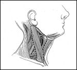 The outlined area demonstrates the extent of dissection in a modified radical neck dissection. The extent of dissection is simiar to that of a radical neck dissection, but the stemocleidomastoid muscle, the spinal accessory nerve, and the internal jugular vein are preserved.FIGURE 7