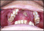 Figure 1: Palatal Ulcer in a Patient With Primary Nasal Lymphoma-The adjoining primary lesion in nasal cavity can only be visualized endoscopically. Eventual necrosis after chemotherapy and radiotherapy results in direct perforation between the oral and nasal cavities, requiring use of a temporary obturator followed by flap reconstruction.