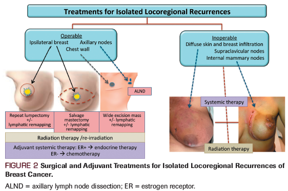 Advances in the treatment of breast cancer have decreased the rate of isolated locoregional recurrences (ILRRs) over time. Surgery, radiation therapy, and systemic therapies are used to manage these failure events and their associated poor prognosis. Operable ipsilateral breast tumor recurrences (IBTRs) are treated by either salvage mastectomy or, in select cases, repeat lumpectomy. Axillary nodal recurrences and postmastectomy chest wall relapses are commonly amenable to surgical resection, too. Repeat sentinel node mapping may be undertaken after IBTRs and chest wall recurrences. Aberrant lymphatic drainage, especially after previous mastectomy, is frequently observed. Adjuvant radiation is recommended for most ILRR cases; the dose and volume must be adjusted for prior to receipt of therapy. Implementation of adjuvant systemic therapies after ILRR should be based on the expression of molecular markers in the recurrent tumor. Administration of chemotherapy for estrogen receptor–negative ILRR is indicated, since it significantly decreases the rate of distant metastases.