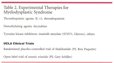 Among newer agents with potential activity against MDS are thrombopoietic agents, such as IL-11, and tyrosine kinase inhibitors such as imatinib mesylate (Gleevec, STI571) (see Table 2, above).
