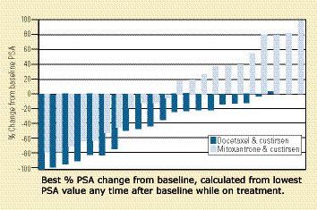 In the CDP group, all but one patient had a reduction from baseline in PSA levels, with values falling by 5% to 100%. In the CMP arm, half of patients had a reduction, with values falling by 5% to 80% (see Figure). Analyses of the entire trial population showed that median survival was significantly longer for patients whose PSA levels fell by more than 30% (19.4 vs 9.7 months).