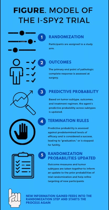 Of these categories, the I-SPY2 trial is considered a platform trial in which certain therapies either “graduate” or are removed from the protocol and new agents or combinations are periodically introduced for evaluation (FIGURE).4