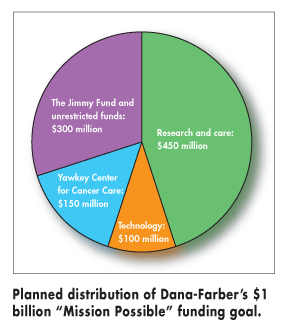 As part of a bold strategic plan called Mission Possible: The Dana-Farber Campaign to Conquer Cancer, the Institute seeks to raise a $1 billion capital investment in four critical areas (see Figure): research and care, technology, the Yawkey Center, and the Jimmy Fund, named for a young cancer patient of Dr. Farber who was introduced to the nation in a 1948 fundraising radio broadcast of the show "Truth or Consequences."