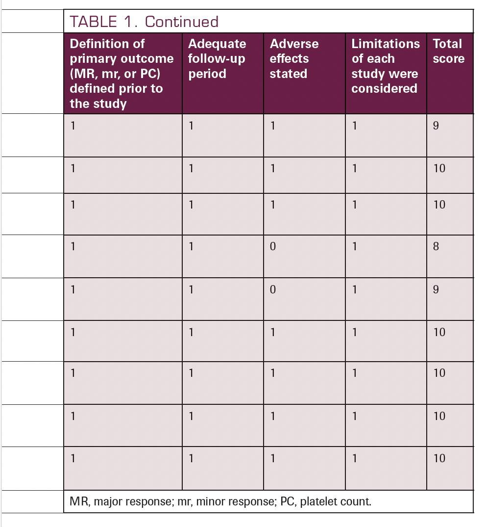 The quality assessment of the included studies was performed by the authors (AB and SS) in accordance with the following items: (1) clarity of the study objectives; (2) study period stated clearly; (3) criteria for patient selection; (4) study conducted in multiple centers; (5) danazol treatment method and dosage mentioned; (6) baseline equivalence groups clearly considered; (7) definition of the primary outcome (major response, minor response, or platelet count defined prior to the study; (8) adequate follow-up period; (9) adverse effects (AEs) stated; and (10) the limitations of each study were considered. We did not use quality assessment as an exclusion criterion. Individual study questions were answered with yes or no, with 1 point awarded for yes and 0 points for no. Total score was calculated for each study. The quality of the included studies was judged to be fair (total score, 8-10), average (5-7), and low (0-4). Consensus with the reviewer (RY) was used to resolve any disputes.